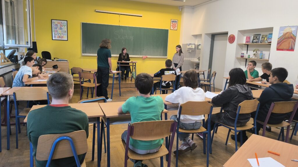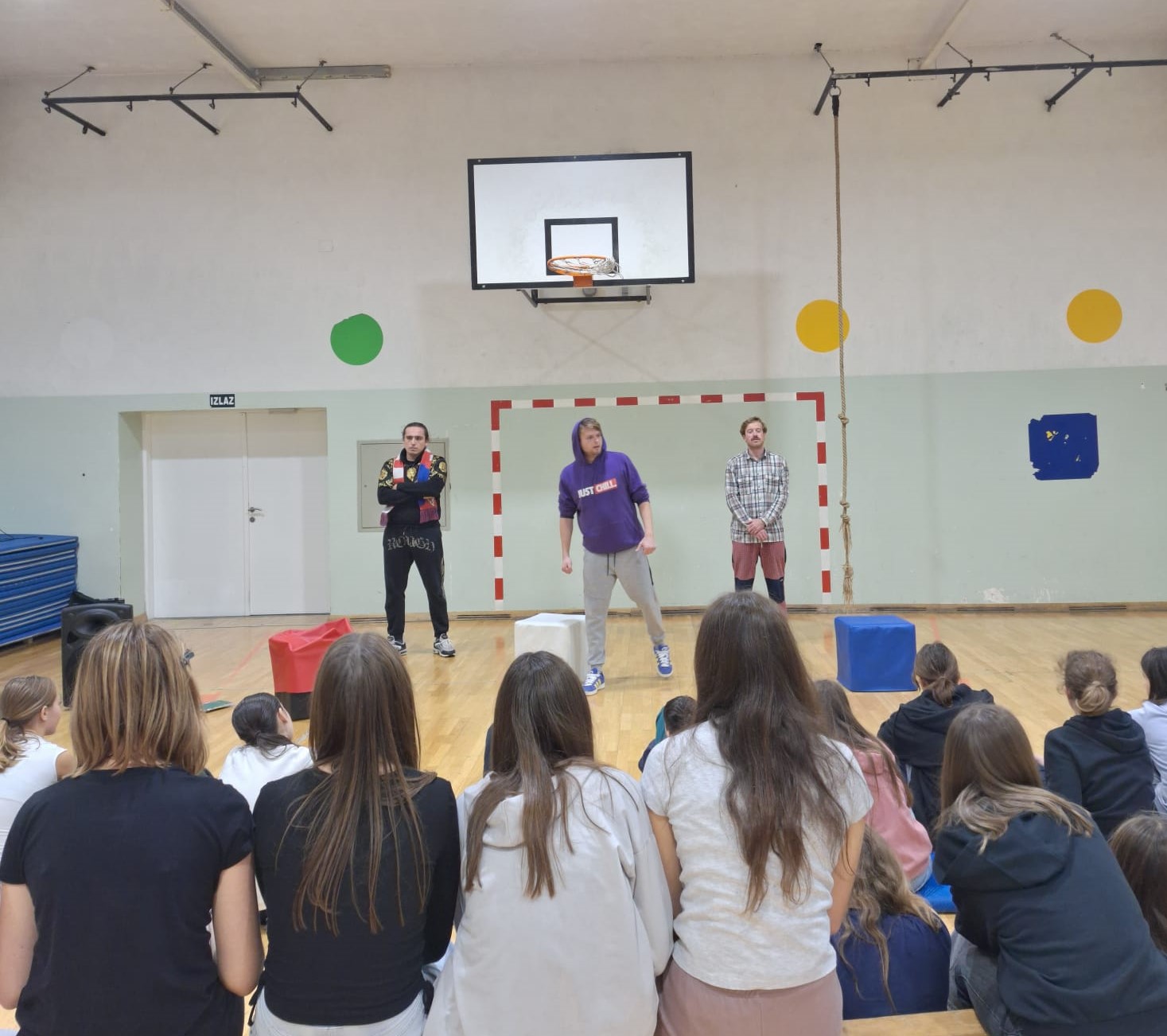 Za sedme razrede danas je u školi održana predstava “Raspucavanje” koja govori o tri školarca kroz čiju se stvarnost reflektiraju brojne opterećujuće činjenice u današnjem hrvatskom multikulturalnom društvu. Izlaz iz svih problema je u zajedništvu koje nam na najbolji način pokazuju igrači naše nogometne reprezentacije oslonjeni upravo na veličanstvenu utakmicu Hrvatske i Brazila u četvrtfinalu Svjetskog prvenstva 2022. godine u Dohi.