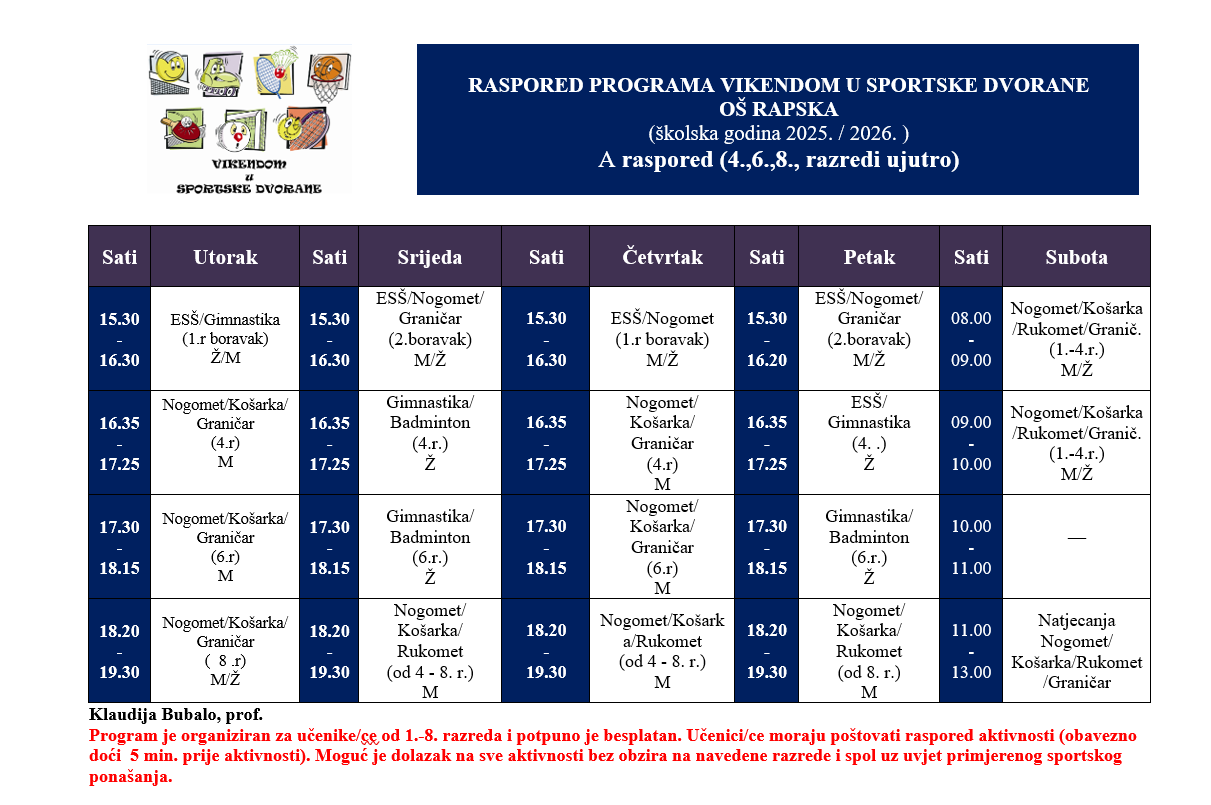 - RASPORED A OŠ RAPSKA Vikendom u dvorane 2025-2026